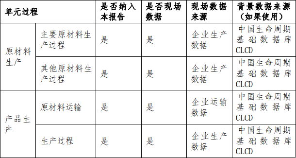 ? 本報告對系統邊界的所有過(guò)程進(jìn)行清單分析,包括所有能源、原材料和主要輔材的輸入,大氣、水體和固廢的排出等,部分消耗?量小于總消耗量?0.1%的輔材本報告中予以忽略?,F場(chǎng)數據均為本公司近?1?年內的有效數據平均,背景數據以代表本國生產(chǎn)平均的數據優(yōu)先進(jìn)行采集。