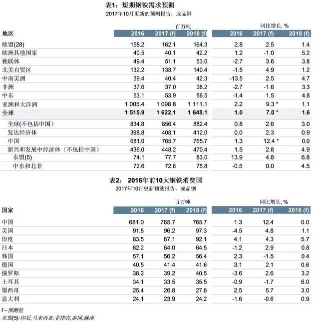 世界鋼鐵協(xié)會(huì )預測,2017年全球除中國外的鋼鐵需求將增長(cháng)2.6%,達到8.564億噸,2018年增長(cháng)3.0%,達到8.8824億噸。