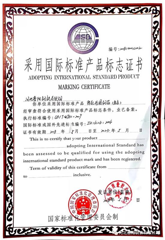 近日,經(jīng)過(guò)國家標準化管理委員會(huì )、河北省質(zhì)量技術(shù)監督局的嚴格檢驗以及行業(yè)專(zhuān)家對產(chǎn)品實(shí)物質(zhì)量與國外同類(lèi)產(chǎn)品質(zhì)量性能指標的比較評估,核定我公司生產(chǎn)的熱軋光圓鋼筋(盤(pán)條)指標完全符合國際標準要求,質(zhì)量達到國際先進(jìn)水平,國家標準化管理委員會(huì )、河北省質(zhì)量技術(shù)監督局特授予《采用國際標準產(chǎn)品標志證書(shū)》和《采用國際標準認可證書(shū)》。這標志著(zhù)我公司的熱軋光圓鋼筋(盤(pán)條)順利通過(guò)“雙采”認證。