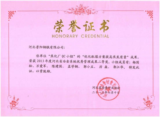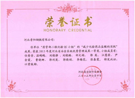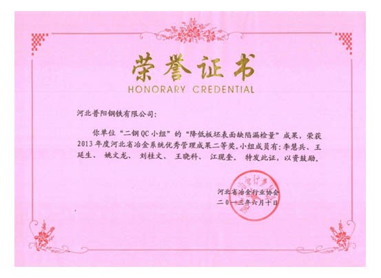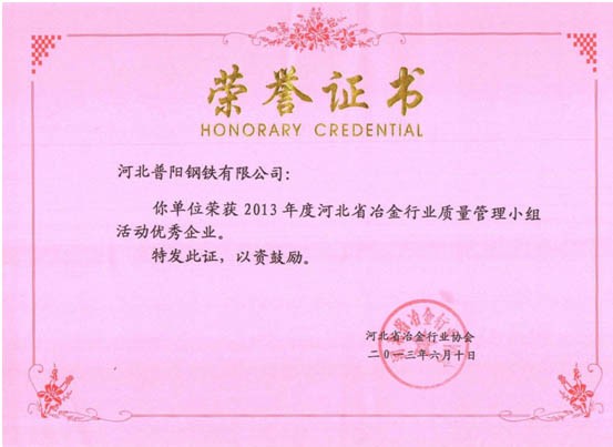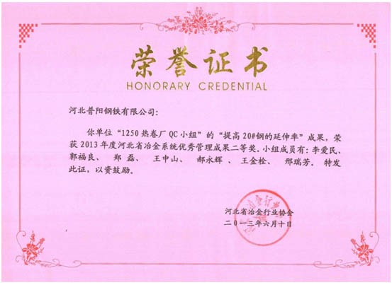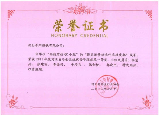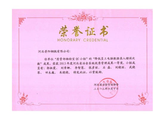QC小組課題獲得了一等獎8個(gè),二等獎3個(gè)的好成績(jì),同時(shí)公司榮獲“2013年度河北省冶金行業(yè)質(zhì)量管理小組活動(dòng)優(yōu)秀企業(yè)”的稱(chēng)號。